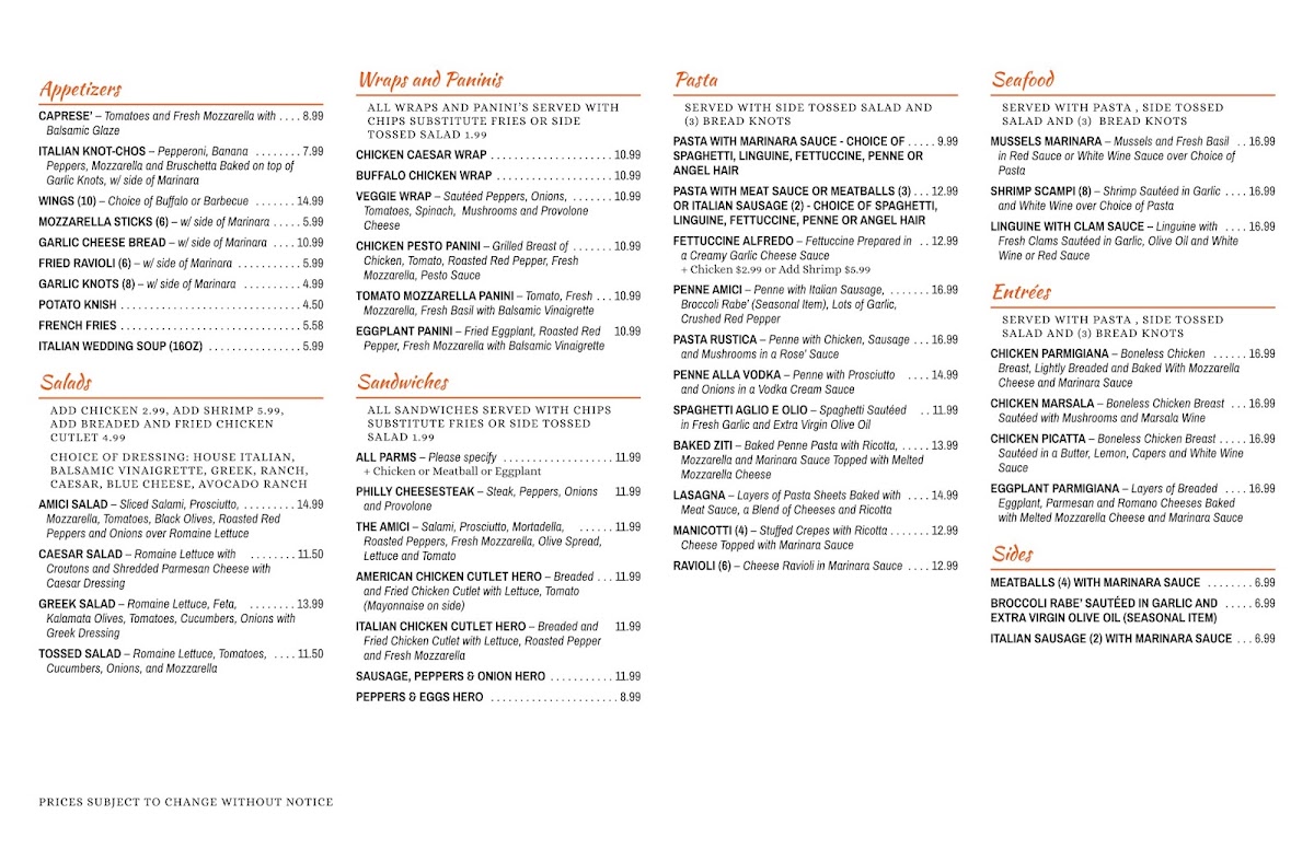 The wraps and paninis, including the Buffalo Chicken Wrap ($10.99) and Chicken Pesto Panini ($10.99), also receive rave reviews. Customers highlight the generous portions and great flavors, perfect for family gatherings or casual dining. Drop by for a memorable dining experience while enjoying the warm, community-focused atmosphere that Amici’s proudly offers. Each bite is a testament to their commitment to quality and service, making Amici's a must-visit destination.