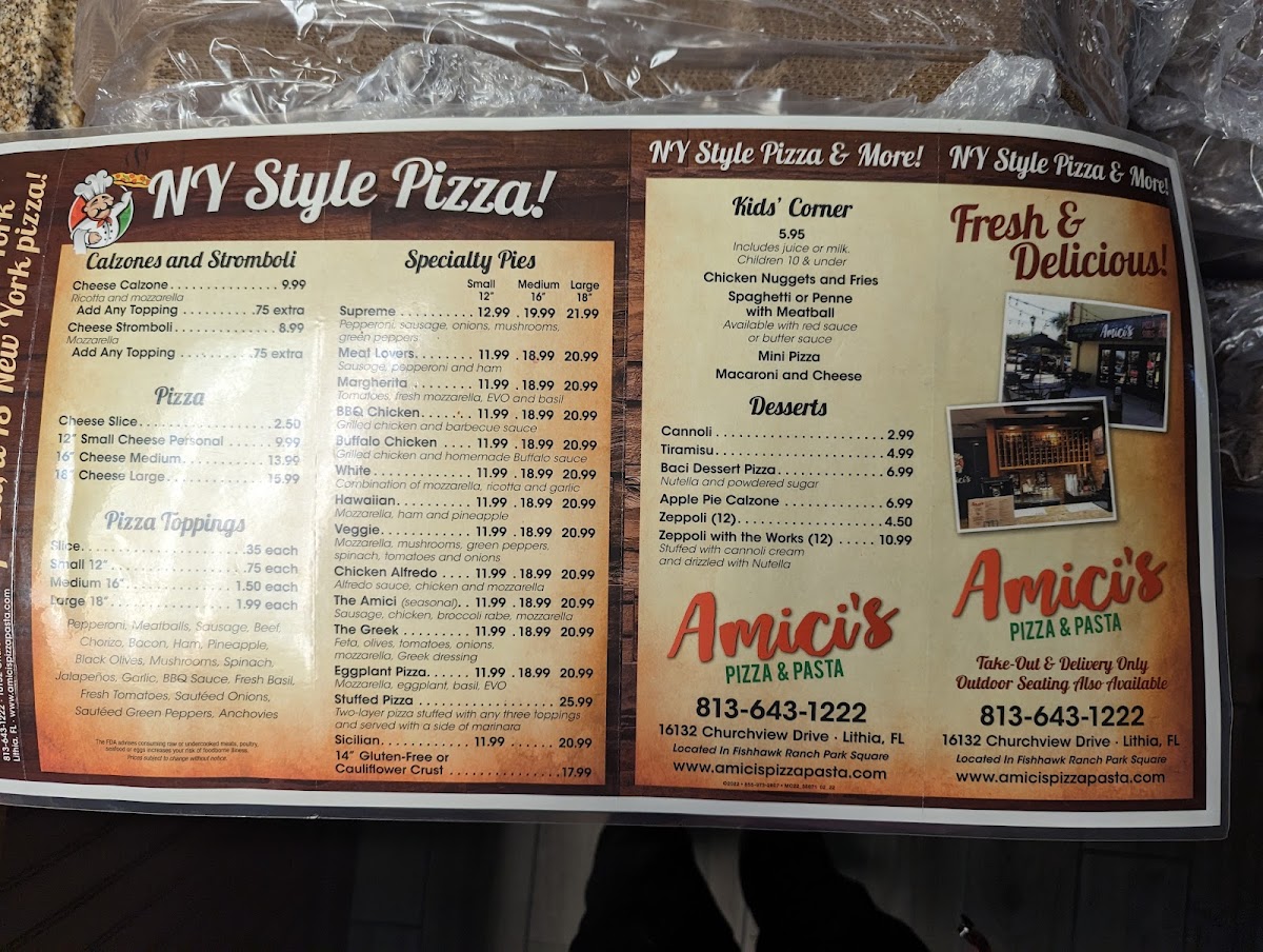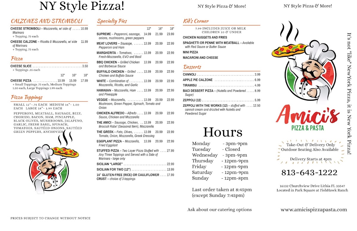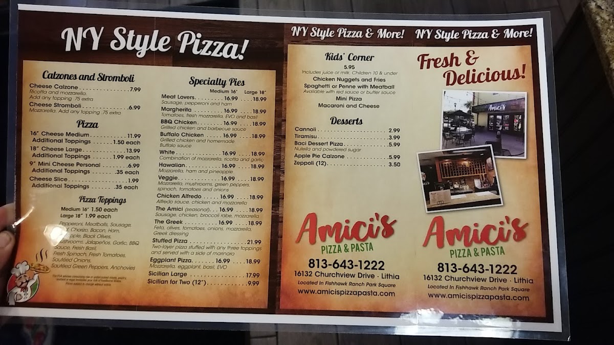 Welcome to Amici's Pizza & Pasta, a delightful culinary gem located in Lithia, Florida. This charming eatery is renowned for its deliciously crafted pizzas and authentic Italian dishes. As you explore the menu, you'll find a variety of mouthwatering options from Italian Wedding Soup ($5.99) to scrumptious Garlic Knots ($4.99). Pair these with their irresistible pizzas, celebrated for a perfectly thin crust that balances gooey cheese and rich sauce without leaving you feeling heavy.